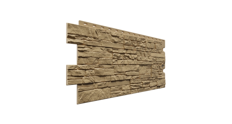 Панели для наружной отделки цоколя или фасада Алтай имеют фактуру, неотличимую на вид, от слоистого песчаника. В коллекции представлено 4 цвета на выбор, включая светлый оттенок коричневого «Корица».