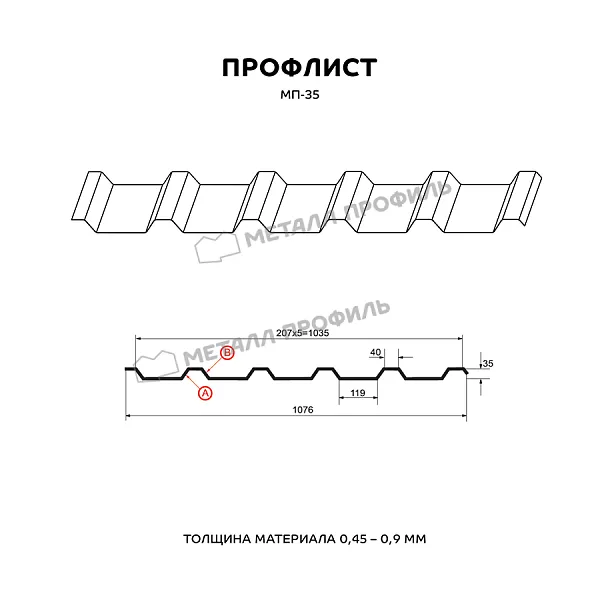 Профлист МЕТАЛЛ ПРОФИЛЬ МП-35x1035-B (PURETAN-20-8017-0,5) широко применяется в Нижнем Новгороде для монтажа профилированного листа. Изначально он представляет собой стальной оцинкованный лист с покрытием. Толщина металла с оцинковкой и защитно-декоративным слоем — 0.5 мм.После проката на специальном оборудовании сталь принимает волнообразный вид. Такая форма придает профилю жёсткость.Профиль МП-35: