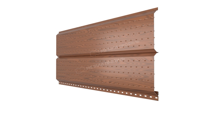 Софит МЕТАЛЛ ПРОФИЛЬ Lбрус-15х240 (ECOSTEEL-01-МореныйДуб-0.5) – это планки сайдинга Lбрус, на поверхности которых нанесена перфорация. Применяется для подшивки кровельных свесов. Софит подчёркивает завершённый и аккуратный вид дома. Отверстия в планках поддерживают доступ воздуха в подкровельное пространство и предотвращают появление грибка, плесени, конденсата.Покрытие ECOSTEEL®: